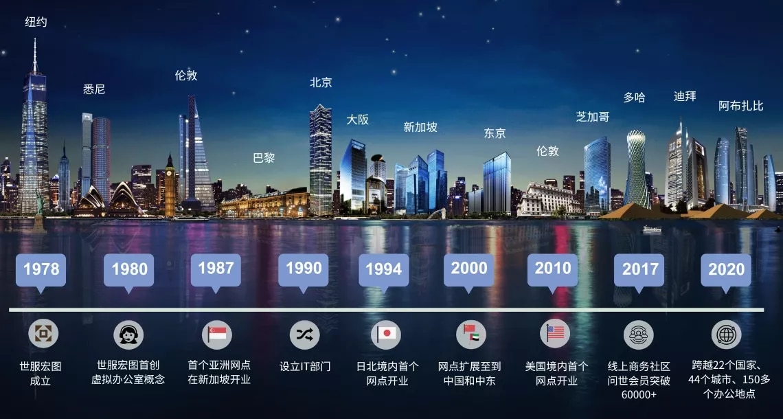 公司创始人兼首席执行官 Alf Moufarrige 先生于1978 年在澳大利亚悉尼注册并成立世服宏图。作为服务式办公室和虚拟办公室行业的开拓者,他在灵活办公领域深耕逾 45 年。值得一提的是,世服宏图正是 30 多年前虚拟办公室的发源地。公司自1987年起走向全球,目前已在全球 19 个国家、40 个城市设有 150 多个办公地点。